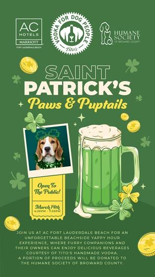 The 171-room AC Hotel Fort Lauderdale Beach will host a Paws & Puptails Yappy Hour event from 4:30 p.m. to 7:30 p.m. on March 14 for an early St. Patrick’s Day celebration. Participants can bring their furry friends to enjoy delicious drinks courtesy of Tito’s Handmade vodka.