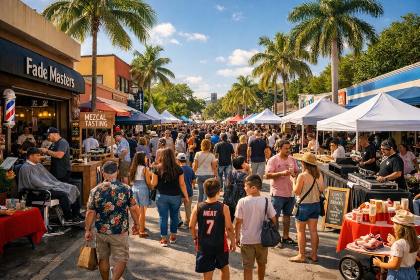 DJs, food and drink activations, open barbershop services, and giveaways turn V’Day into a full-street celebration in the heart of the Grove.