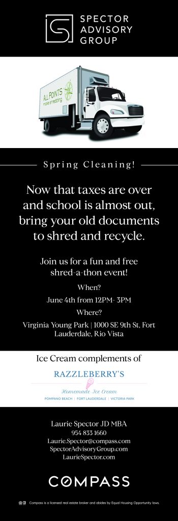 Residents can swing by Virginia Young Park in Fort Lauderdale for a free Shred-A-Thon event to dispose of paper documents properly. Spector Advisory Group Realtors hosts the no-cost drive-up event with ice cream from Razzleberry’s Homemade Ice Cream served. Children are welcome to attend to experience the new playground equipment at the park, 1000 SE