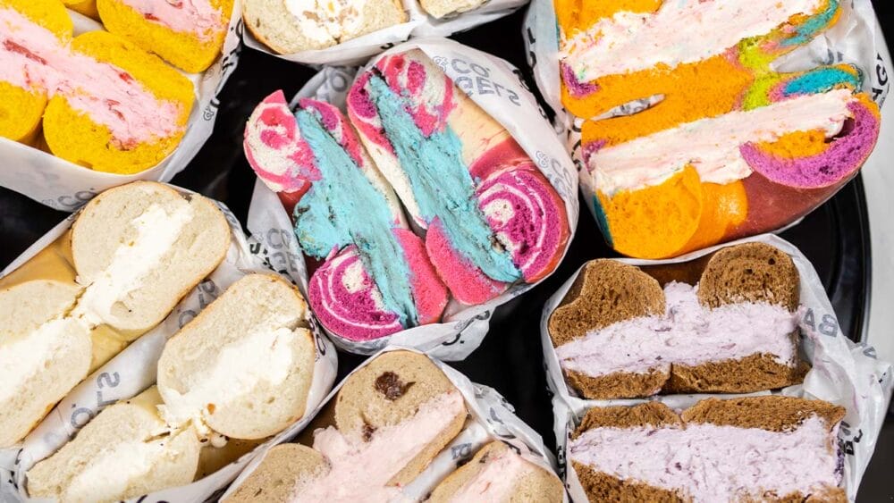 Bagels & Co. offers a variety of quick-serve and family-friendly cafes that serve indulgent cream cheese flavors. These flavors are displayed colorfully, like gelato in an ice cream parlor. Some iconic flavors include bacon cheddar, birthday cake, black truffle, cookie monster, S’mores, sriracha scallion, roasted garlic, vegan tofu spreads, and more. Whenever the company opens in a new city, seasonal cream cheese flavors are added to reflect the city, local sports teams, and other factors.