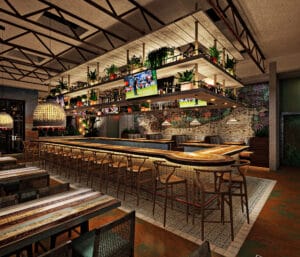 The venue’s interior was designed as a tropical outpost. The indoor-outdoor concept boasts 6,714 square feet of indoor dining and bar space and 2,640 square feet of outdoor patio seating. Baresco will also feature a dedicated private dining room with full AV capabilities to host meetings and special events.