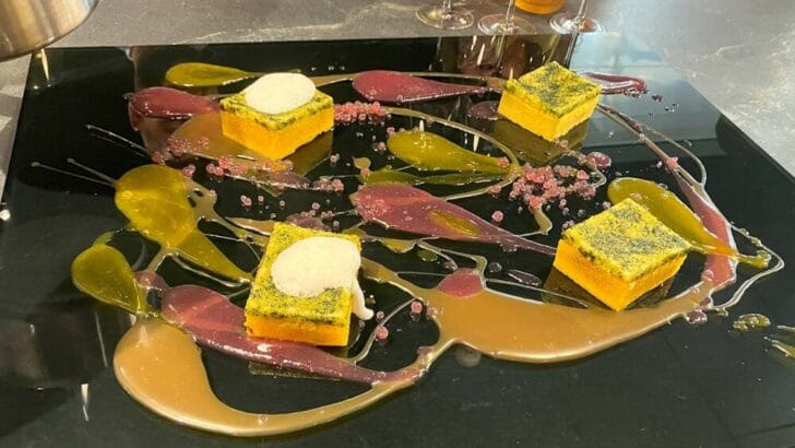 Not to be outdone, the pastry chef, Jed Brian, gave a bravura performance that started out curiously, with abstract, Jackson Pollack-like dribbles of sweet and citrusy sauce arrayed across glass panes. The dessert ended in sublime sweetness. “We call this ‘the Cleanup,’” Brian explained. “It melts in your mouth.” To understand why, you’ll have to book passage on Scenic Eclipse II. Cake-lovers, I can reveal, will be over the moon.