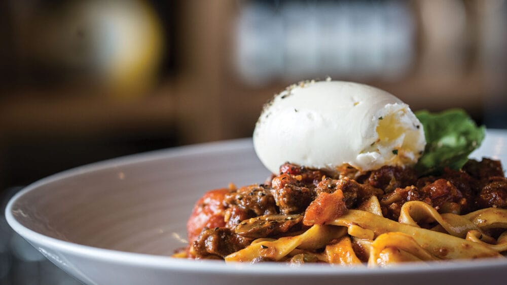 The ground floor restaurant’s expansive menu features house-made Italian classics, such as Pinstripes’ signature Fettucini Bolognese with a sauce made from certified Angus beef, Italian San Marzano tomatoes and topped with creamy mascarpone cheese.