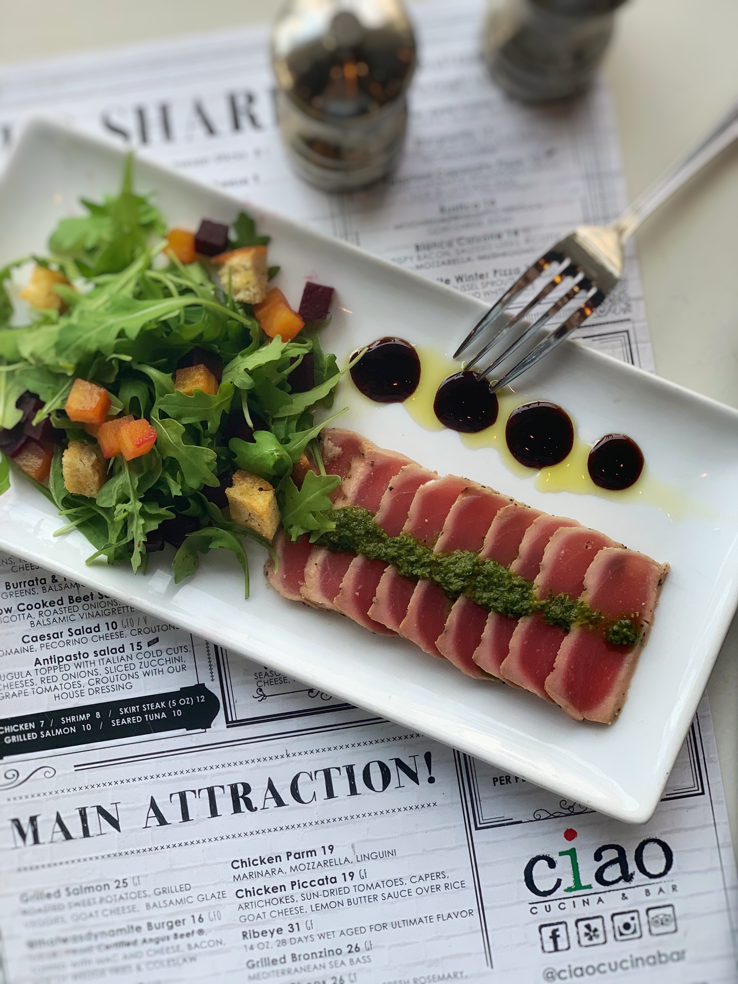 Ciao is a favorite among Creek residents for delicious food and delightful drinks. Guests can enjoy an upbeat atmosphere while dining on an assortment of meals and appetizers. Those looking for lighter fare packed with flavor can order the seared ahi tuna with arugula and beets.