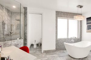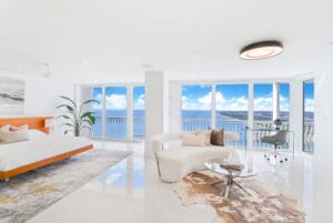 The story: This rare double play at Point of Americas II, located on the southernmost tip of Fort Lauderdale Beach, not only gives residents room to roam—but it also provides sweeping 270-degree views of the Port Everglades Inlet and south all the way to Miami. The exquisitely renovated corner layout combines two units into one, creating a suite life that’s best captured by the oversized master bedroom (pictured) that overlooks the ocean.