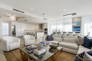 Stunning spaces: Prestigious Las Olas Isles provides the neighborhood setting for this home-style condominium at AquaMar. Walls of glass and four spacious balconies overlooking the Intracoastal Waterway invite the outdoors inside this sprawling open floor plan. Bright, white contemporary furnishings and accessories made of glass add to the soothing living spaces featured here. The unit comes with a 50-foot slip for boating enthusiasts.