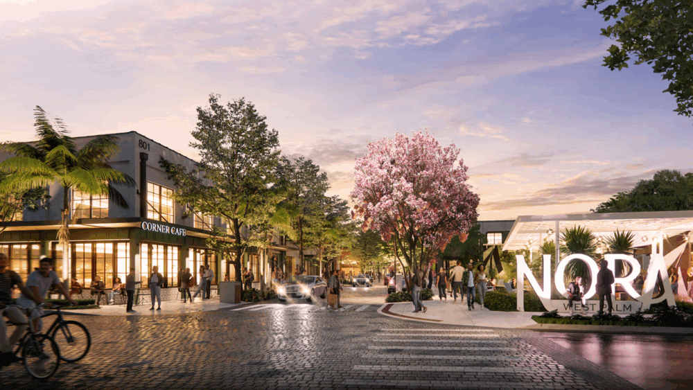 The Nora District in West Palm Beach will feature retail and office spaces, set to open in late 2025.